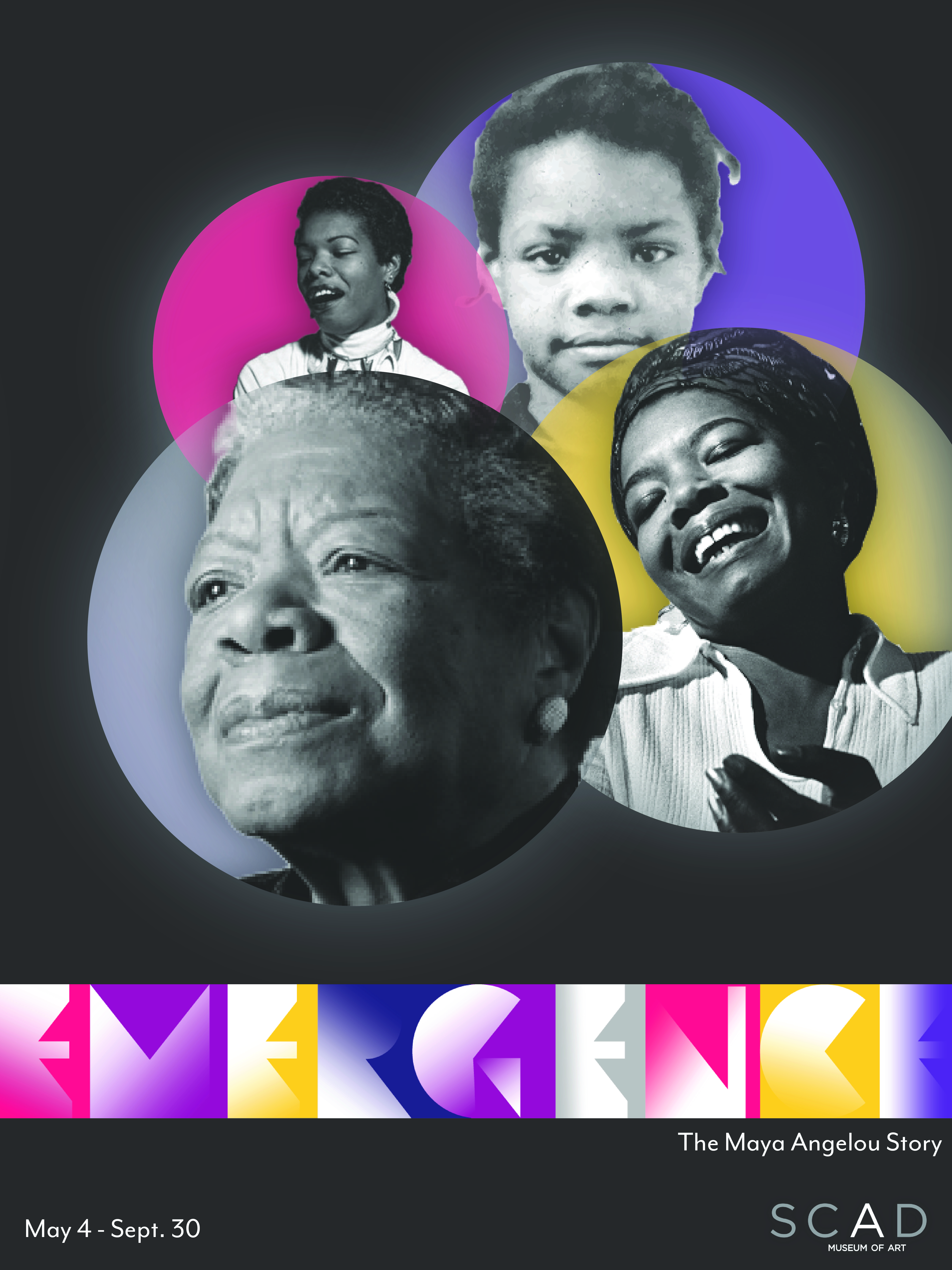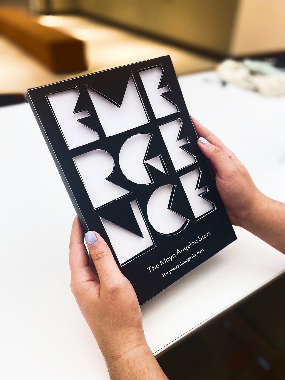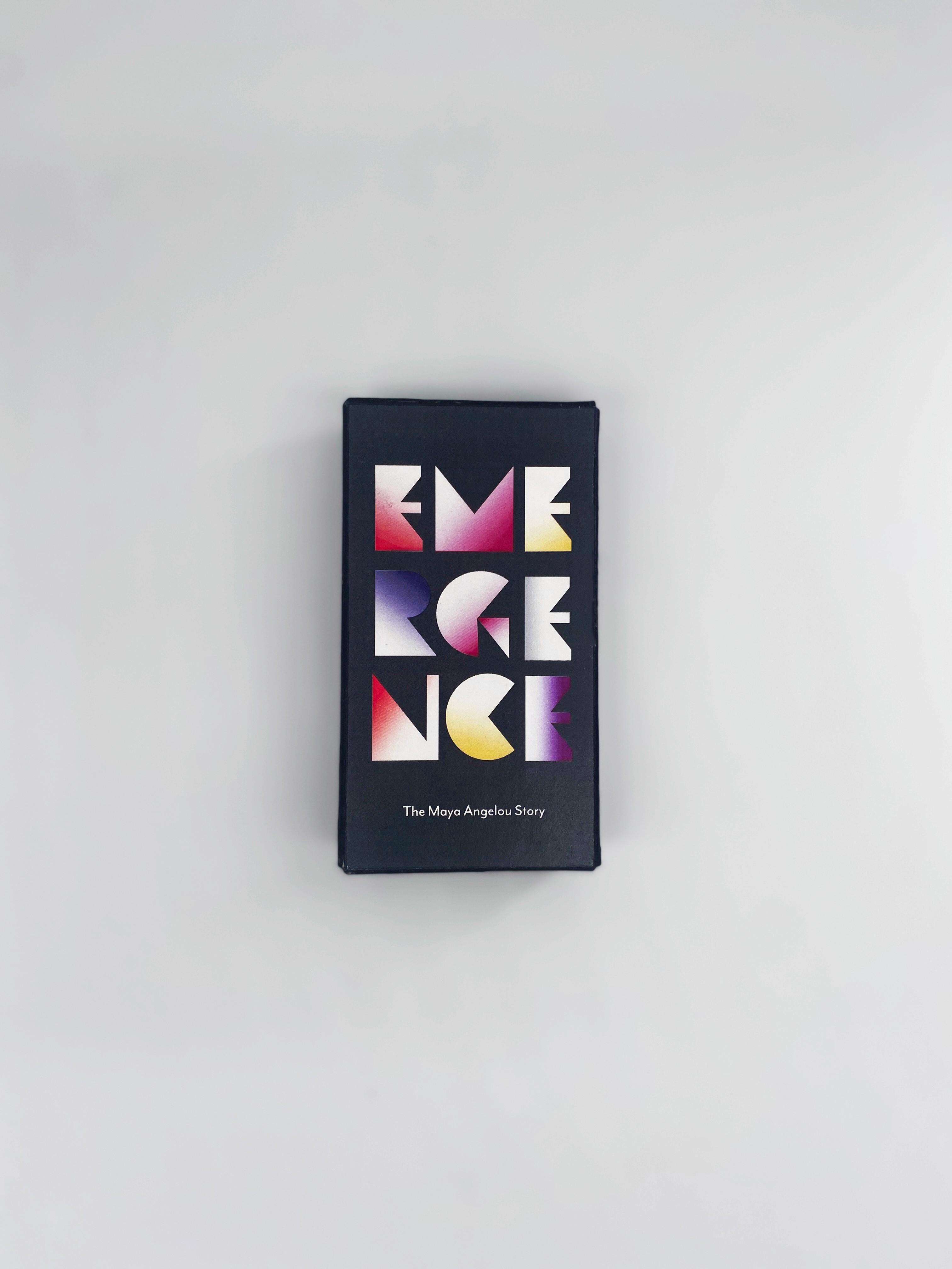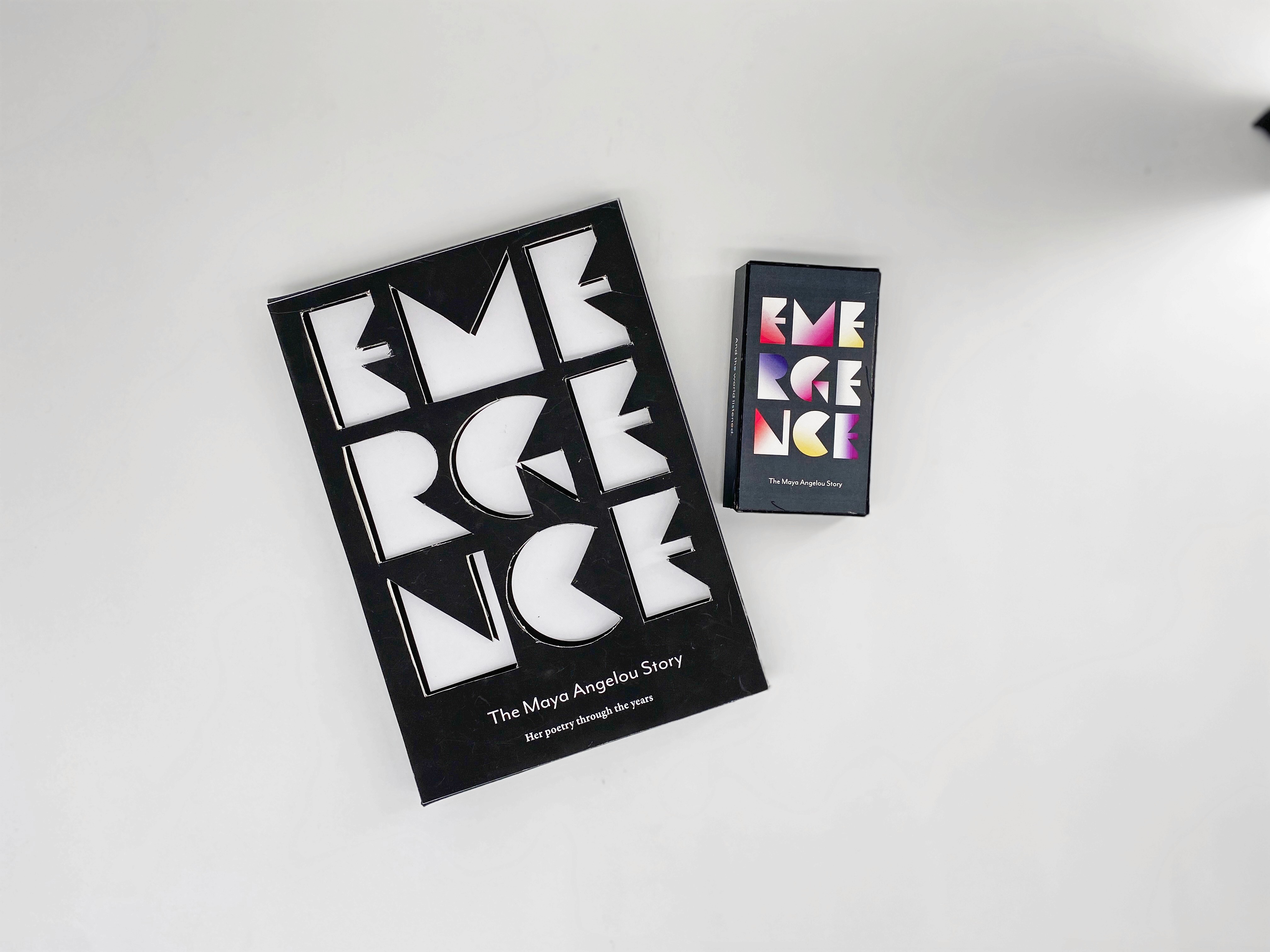 Emergence is a tribute exhibition honoring Maya Angelou's literary legacy and cultural impact. The brand system celebrates her voice through layered typography and archival imagery, spanning an interactive exhibition wall, multifunctional souvenir book, environmental graphics, and commemorative merchandise.