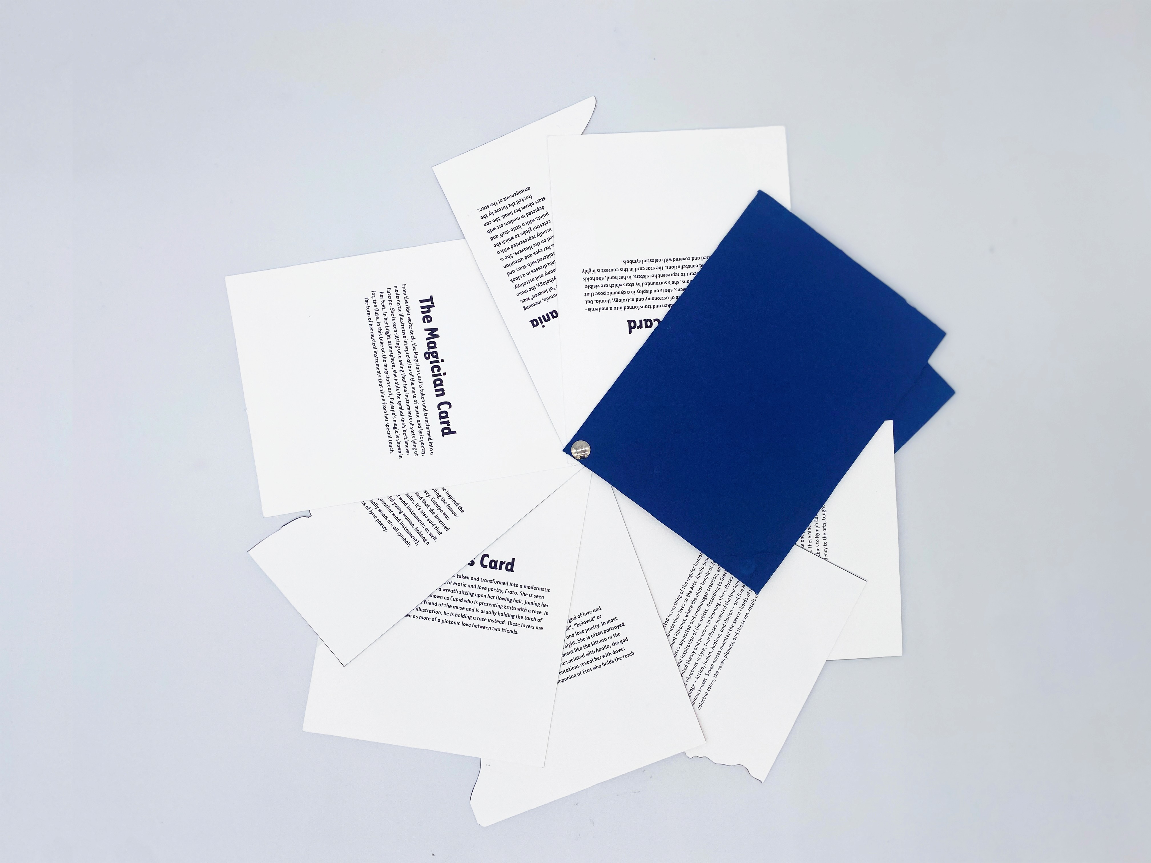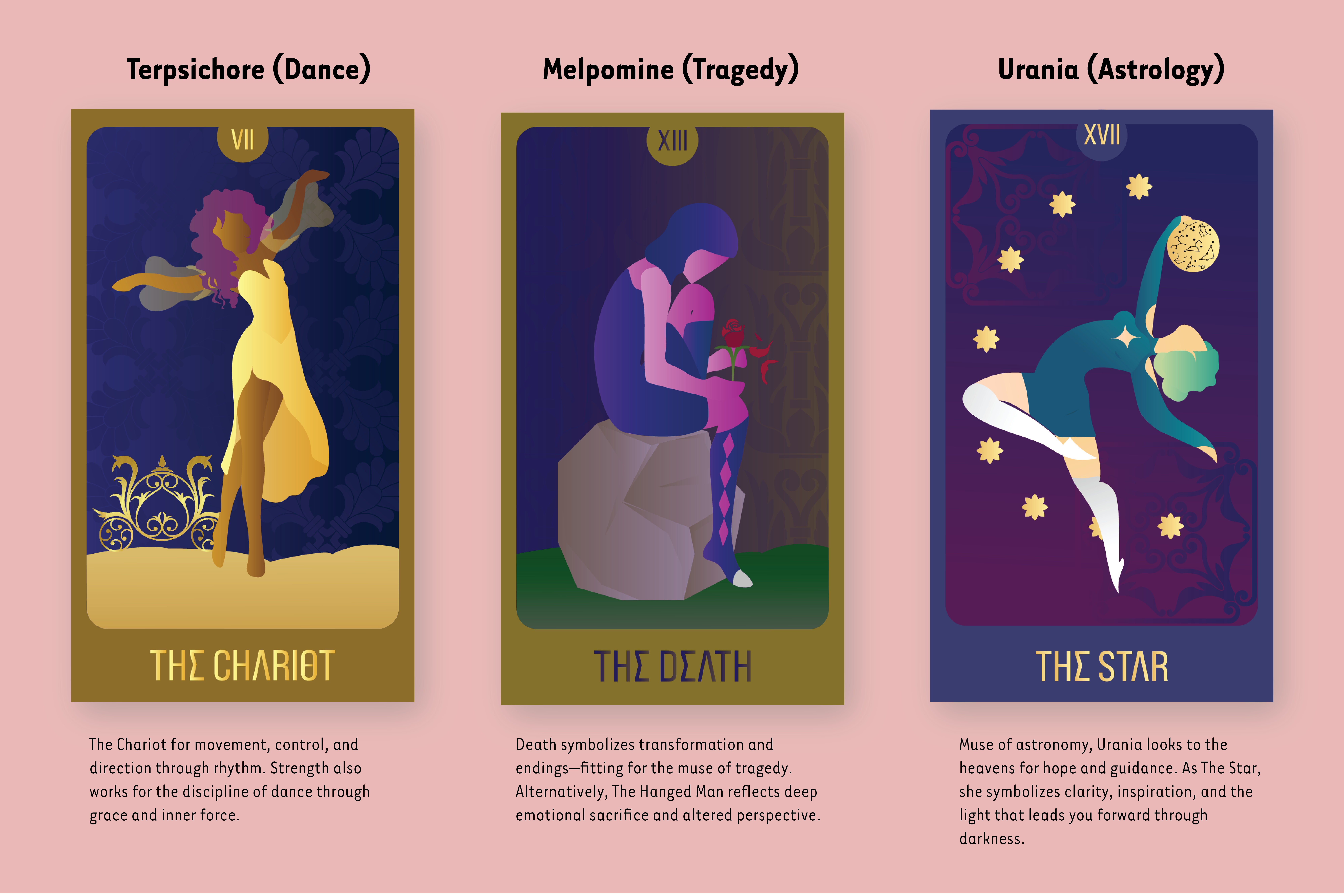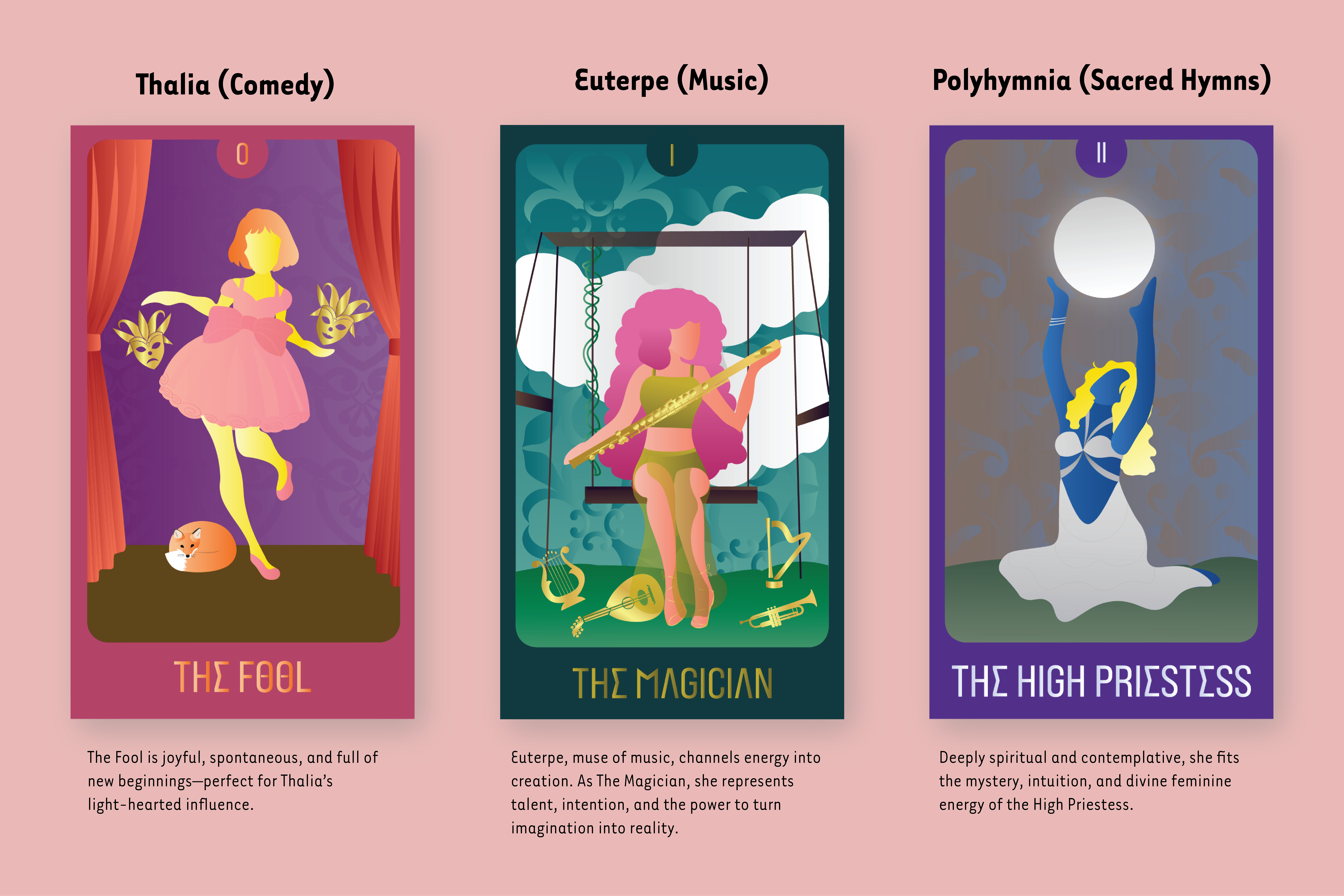 There are many stories in mythology, but none of them would exist without the beautiful muses. Goddesses are said to bring inspiration and ideation to the arts and sciences; they symbolize a key piece in making the world more vibrant. I decided to create cards for each of the nine muses and alter them for a more modern twist. These cards were chosen based on what each muse represents and symbolizes both mythologically and spiritually.