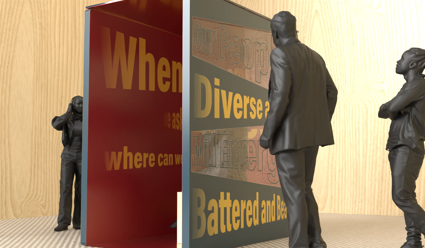 The sound booth extends the motion design concept into a personal, immersive experience. A single occupant sits inside while Gorman's voice plays, surrounded by kinetic typography that visualizes her words in real time—poetry becomes multisensory, enveloping the participant both aurally and visually.